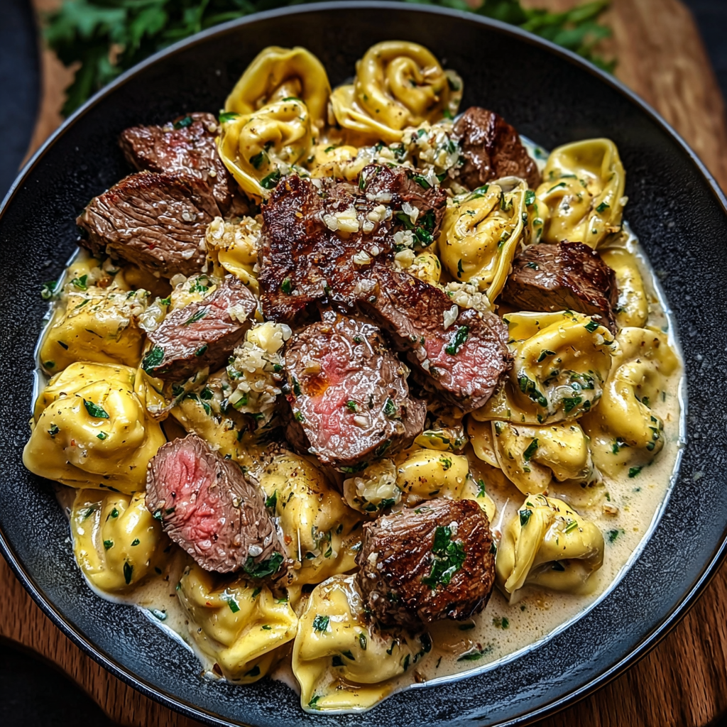 Tortellini Steak Slices with Crushed Garlic