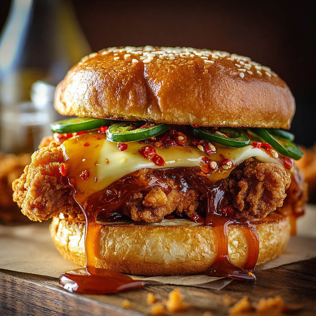 Crispy Fried Chicken Sandwich Dipped in Honey & Chili